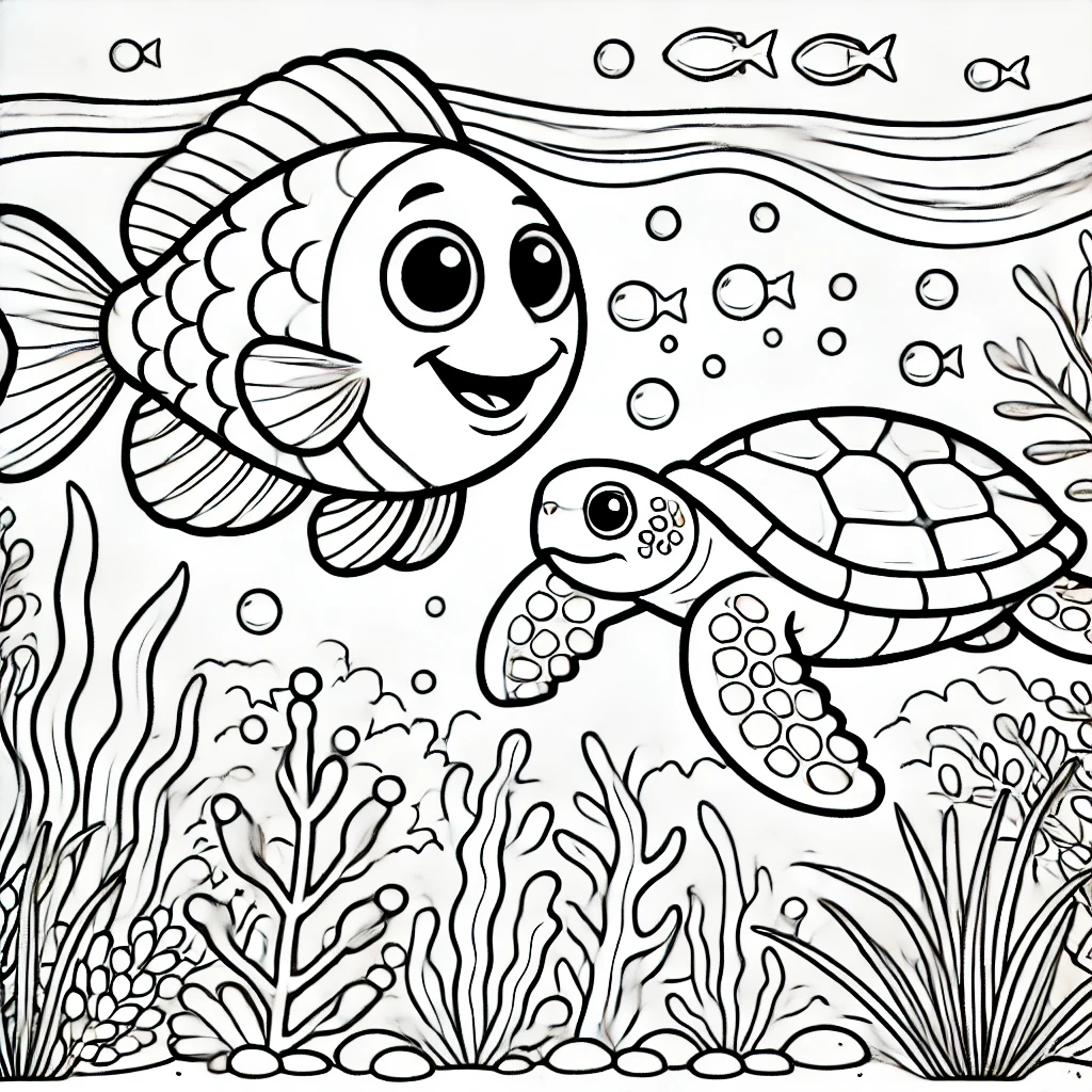 Underwater Adventure: "Create a coloring page featuring a smiling fish, a sea turtle, and simple ocean plants, with lots of open water space."